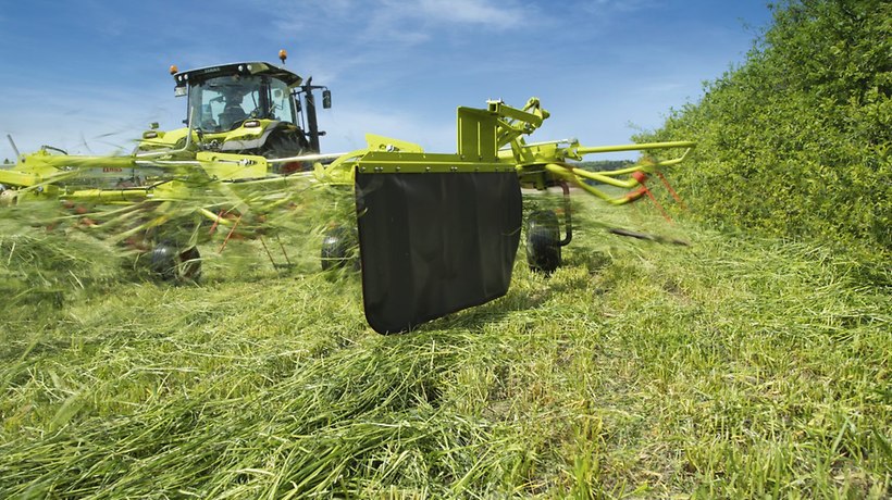 Mit der Randstreueinrichtung erreichen Sie auch in den Randbereichen eine gleichmäßige Abtrocknung des Ernteguts. Durch Schwenken des Randstreutuchs in den Arbeitsbereich begrenzen Sie die Flugbahn des Futters und sorgen so dafür, dass es dort bleibt, wo es hingehört. Zudem arbeiten Sie stets mit der vollen Arbeitsbreite und vermeiden das für die Maschine schädliche Schrägstellen der Laufräder. Auch beim Einsatz im Heu ist das Randstreutuch hilfreich. Durch dessen Einsatz als Markierungshilfe wissen Sie stets, welche Stellen Sie bereits bearbeitet haben und vermeiden doppelte Überfahrten.